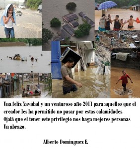 Bueno, se nos acabo este año mis amigos, lo que fue, fue. Mis mejores deseos de felicidad y prosperidad para todos Uds., en este nuevo 2011. Como ya saben aún sigue lloviendo en mi querida tierrita, ya vamos por 2,2 Millones de damnificados, 4.500 viviendas o sitios de alojamiento totalmente destruidos, 285.000 viviendas afectadas en mayor o menor grado, ni para que les cuento de los problemas viales, de los cultivos, de obras de interés público como hospitales, escuelas, mercados, etc., etc., etc., la peor tragedia invernal que nos ha tocado. Si el presidente tenía que hacer mas de 800 viviendas diarias según lo ofreció ahora le toca hacer 1.200, algo imposible, pero definitivamente necesarias. Creo que se evidencia en las fotografías de estos siniestros, que la arquitectura habitacional y métodos constructivos de estas poblaciones no fueron los más adecuados, la conquista, la colonia y la república de mi país no nos dejo lo mejor en ese aspecto.