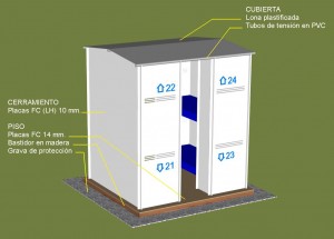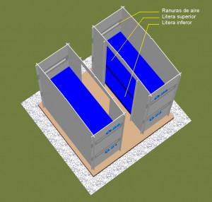 Estas unidades de dormitorio permiten la ocupación de 4 personas en un recinto parcialmente cerrado, la unidad dispone de ciertas placas enfrentadas y que tienen un ranurado inclinado para permitir la entrada de aire y una circulación cruzada para refrescar un poco el reposo. Esta solución temporal prefabricada de construcción por encaje se arma fácilmente por dos personas en menos de dos (2) horas y permite que lo hagan sus propios usuarios, lo que les da una tranquilidad al verse útiles en remediar o mitigar su situación, mediante este proceso de auto construcción. Me parece que el descanso y sueño, alivia la tensión y permite aguantar la tragedia con resignación y dignidad. Los colores claros ayudan a mantener mas baja la temperatura por su menor absorción de calor. También se pueden construir con tableros de madera aglomerada tipo RH o del tipo OSB.
